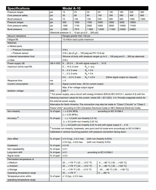 Προδιαγραφές Προαιρετικά το μοντέλο A-10 διατίθεται με βελτιωμένη μη γραμμικότητα.5 % της διαστολής Μη γραμμικότητα ≤ ±0.25 % εύρους μη γραμμικότητας ανά BFSL ανά IEC 61298-2 Πεδίο μέτρησης ≤ 0,1 bar [≤ 1,45 psi] ≤ ±0,5 % εύρους - Πεδίο μέτρησης > 0,1 bar [> 1,45 psi] ≤ ±0,5 % εύρους ≤ ±0.25 % του εύρους 1) Ακριβότητα → Βλέπε ∆ανέξ. μέτρητο σφάλμα ανά IEC 61298-2 Max. μέτρητο σφάλμα ανά IEC 61298-2 Πεδίο μέτρησης ≥ 0,6 bar [≥ 8,7 psi] ≤ ±1 % του εύρους ≤ ±0,5 % του εύρους Πεδίο μέτρησης ≥ 0,4 bar [≥ 5,8 psi] ≤ ±1,2% του εύρους ≤ ±0.7 % του εύρους Διάστημα μέτρησης ≥ 0,25 bar [≥ 3,6 psi] ≤ ±1,3 % του εύρους ≤ ±0,8 % του εύρους Διάστημα μέτρησης ≥ 0,16 bar [≥ 2,3 psi] ≤ ±1,5 % του εύρους ≤ ±1 % του εύρους Διάστημα μέτρησης ≥ 0,1 bar [≥ 1,45 psi] ≤ ±1.8 % του εύρους - Πεδίο μέτρησης ≥ 0,05 bar [≥ 0,73 psi] ≤ ±2,4 % του εύρους - Σφάλμα μηδενικού σημείου 2) 3) 4... 20 mA / DC 1... 5 V / DC 0,5... 4,5 V / DC 0,5... 4,5 V ρασιομετρικό ≤ ±0,3 % του εύρους ≤ ±0.2 % της διάταξης DC 0 ... 10 V ≤ ±0,5 % της διαστολής ≤ ±0,4 % της διαστολής DC 0... 5 V 4) ≤ ±0,6 % της διαστολής - 1) Δεν είναι δυνατό με σήμα εξόδου DC 0... 5 V. 2) Περιοχές μέτρησης ≤ 0,1 bar [≤ 1.45 psi] (ή ισοδύναμο) είναι δυνατή μόνο με ≤ ±0.5 % του εύρους. 3) Εκτός των συνθηκών αναφοράς, προστίθεται η υστερέζη θερμοκρασίας για περιοχές μέτρησης < 0,6 bar [< 8,7 psi]. 4) Δεν είναι δυνατή με περιοχές μέτρησης ≤ 0,1 bar [≤ 1,45 psi] (ή ισοδύναμες).Σε περίπτωση περιστασιακών βλαβών που οφείλονται σε ηλεκτροστατικές εκκενώσεις, μπορεί να προκύψει προσωρινό πρόσθετο σφάλμα μέτρησης έως και ±2,5%.![]()