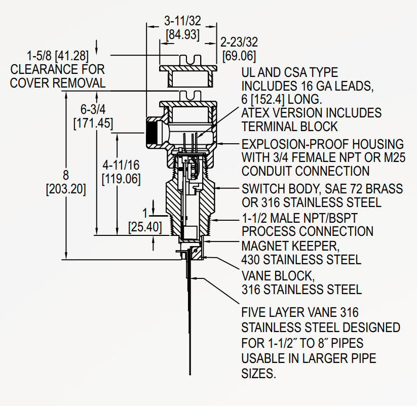 | Τύπος διακόπτη | SPDT snap switch standard, DPDT snap switch προαιρετικός | Σύνδεση επεξεργασίας | 1-1/2˝ αρσενικό NPT ή 1-1/2˝ αρσενικό BSPT |